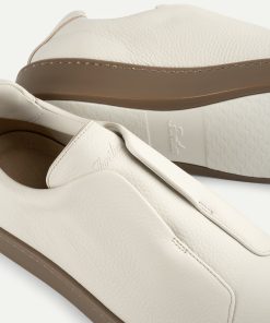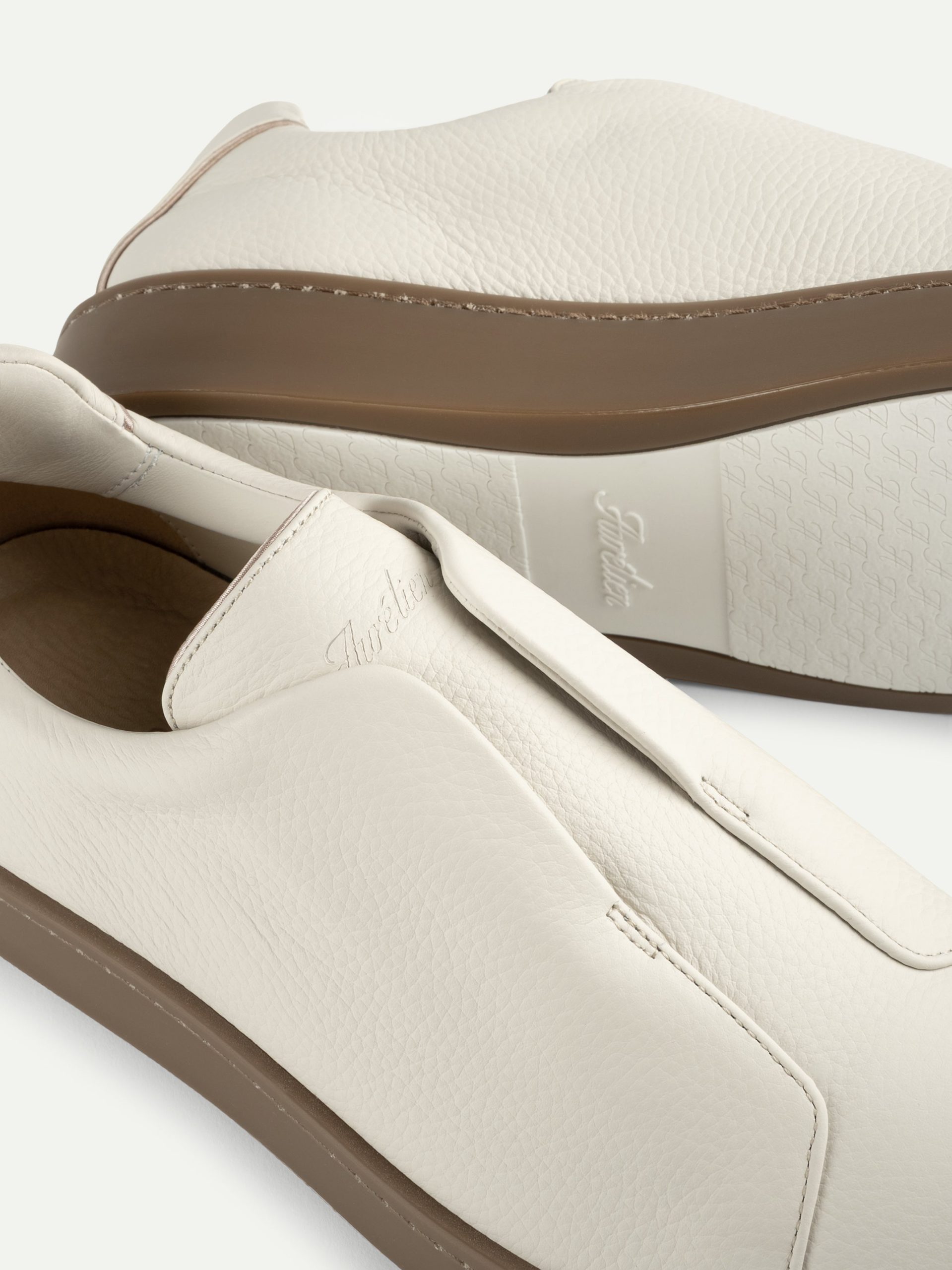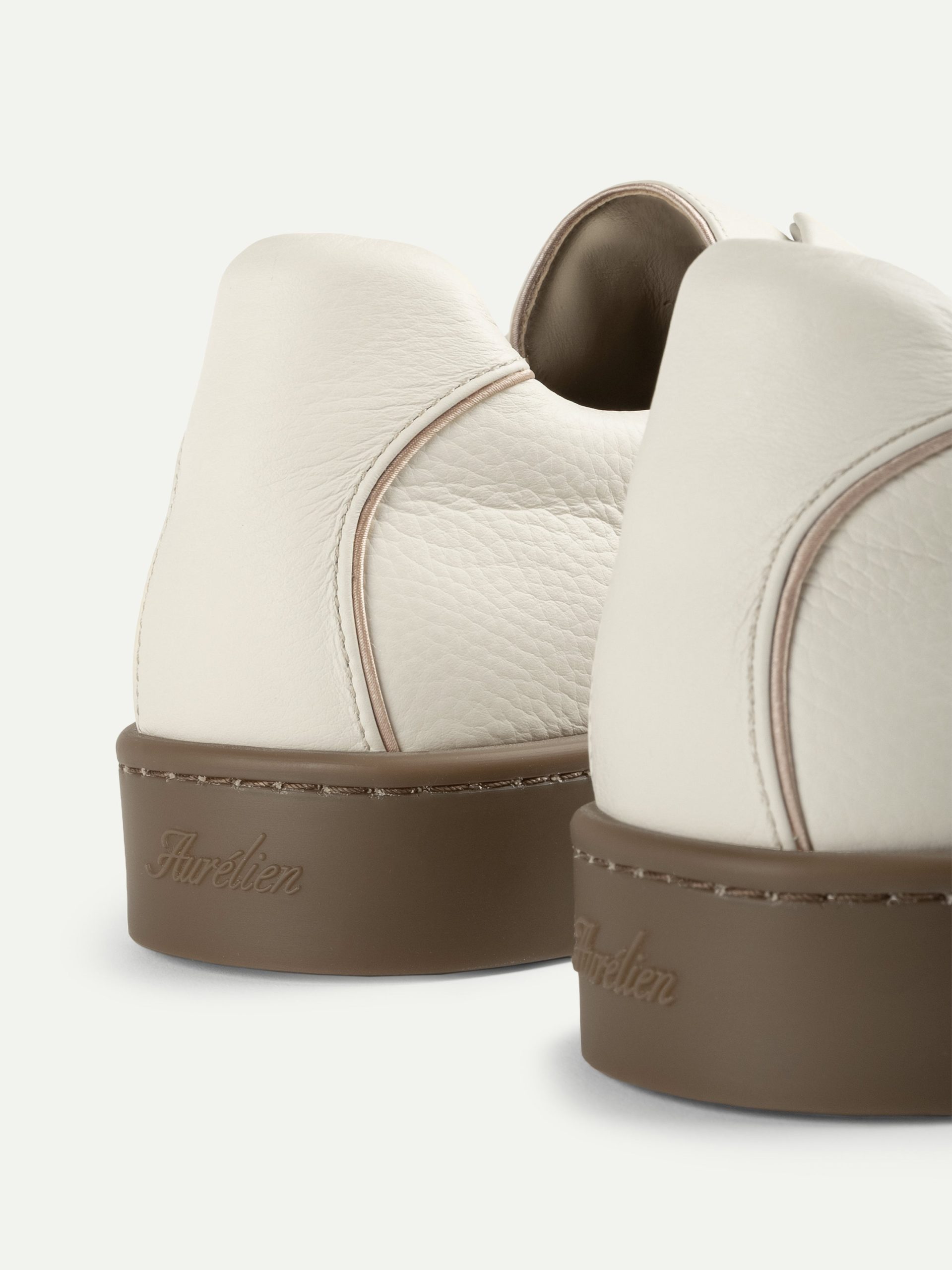 The Aurélien AUR3 Sneaker is a modern expression of understated elegance, combining minimalistic design with exceptional craftsmanship. Made from supple grain leather, this soft calfskin offers the luxurious feel of deerskin with enhanced durability. Its distinctive laceless silhouette creates a sleek and contemporary look, while brown rubber soles, embossed with the Aurélien monogram, provide both lasting comfort and a refined finish. A subtle gold satin trim on the heel and tongue adds a signature touch of sophistication. With its flawless construction and quiet confidence, the AUR3 Sneaker captures the essence of modern luxury—effortless, refined, and unmistakably Aurélien.