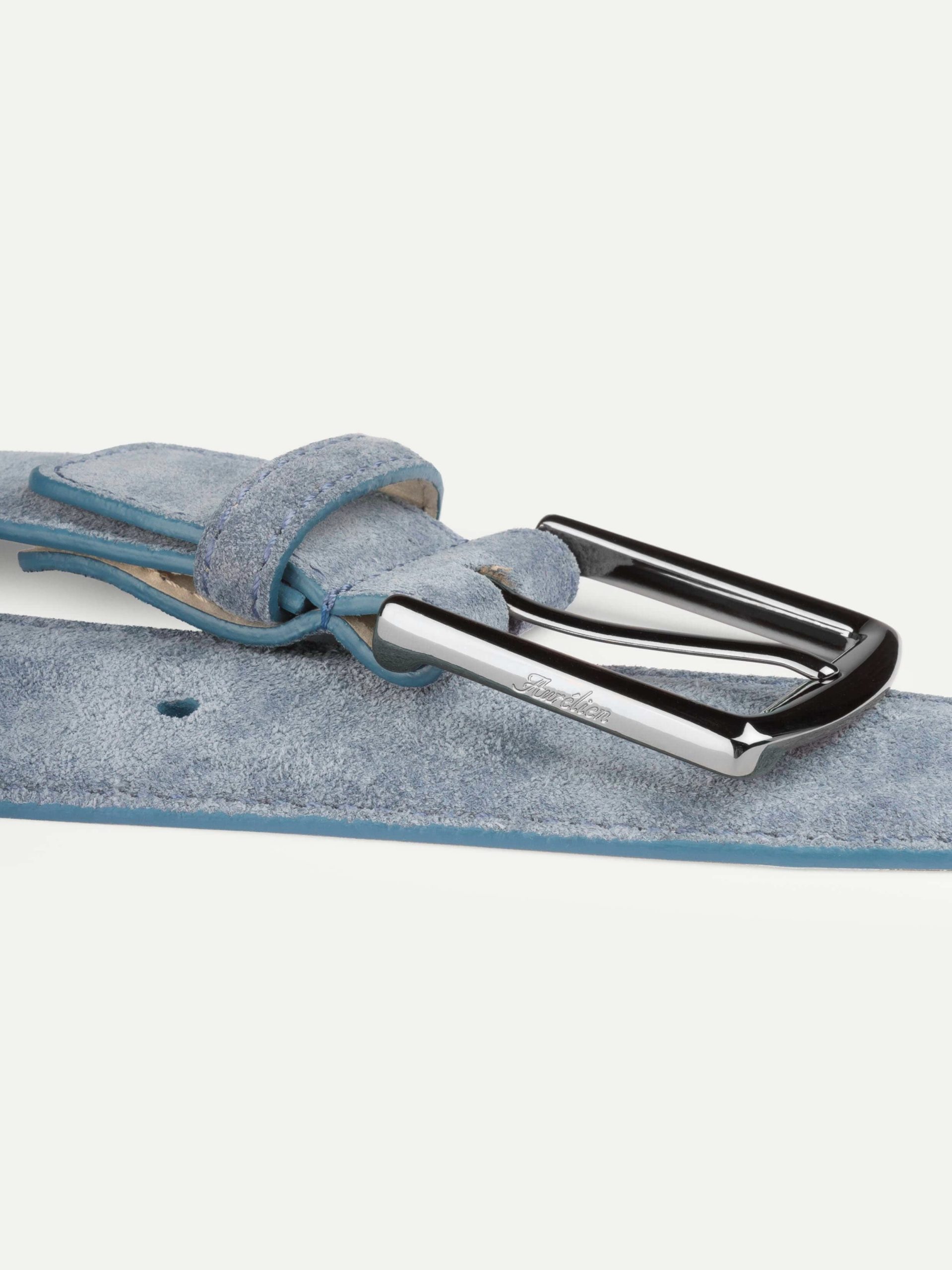 Highly supple belt made of Softey® suede and nubuck that teams clean lines with a polished gun metal buckle, making it a timeless and versatile addition to any man’s repertoire. Faultlessly crafted in Italy, it’s an equally sharp choice for light or dark trousers. Removable buckle to adjust the belt to perfect fit, one size fits all. Matches with the light blue suede driving shoes, sneakers and loafers.