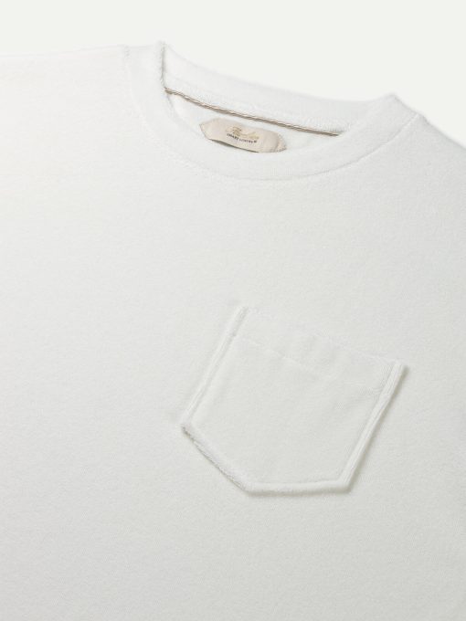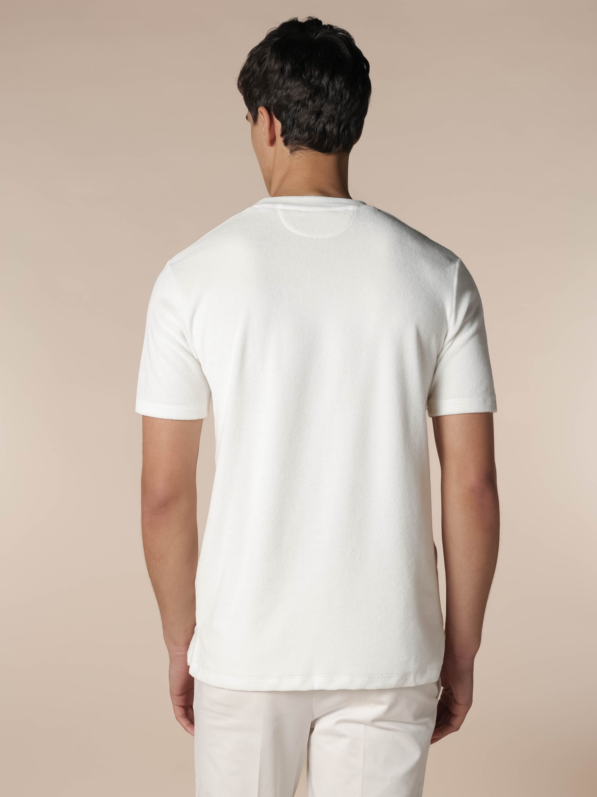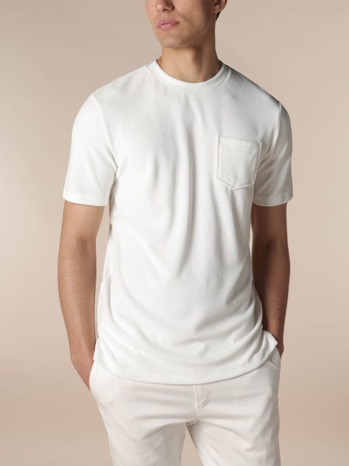 The iconic Aurélien Terry Towelling T-Shirt is a must-have staple, seamlessly blending comfort and sophistication. Crafted from incredibly soft cotton-terry fabric, it’s perfect for effortless style from the city to the sun lounger. Designed with a distinctive chest pocket and a wider collar, it offers a relaxed yet refined look. The signature Aurélien satin gold trim in the neck adds a subtle touch of elegance. With its timeless appeal, this holiday essential only gets better with each wear.